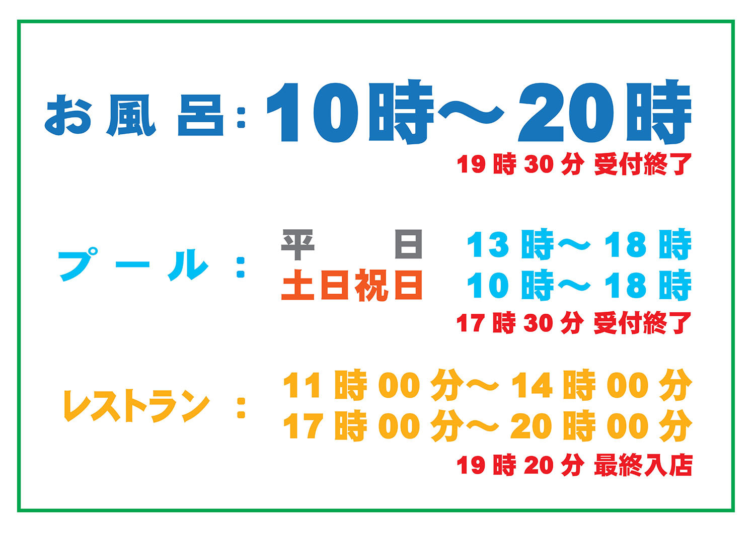 現在休止中 の プール施設 : ウォータースライダー / 箱蒸し / 圧注浴 / 気泡浴 / 寝湯