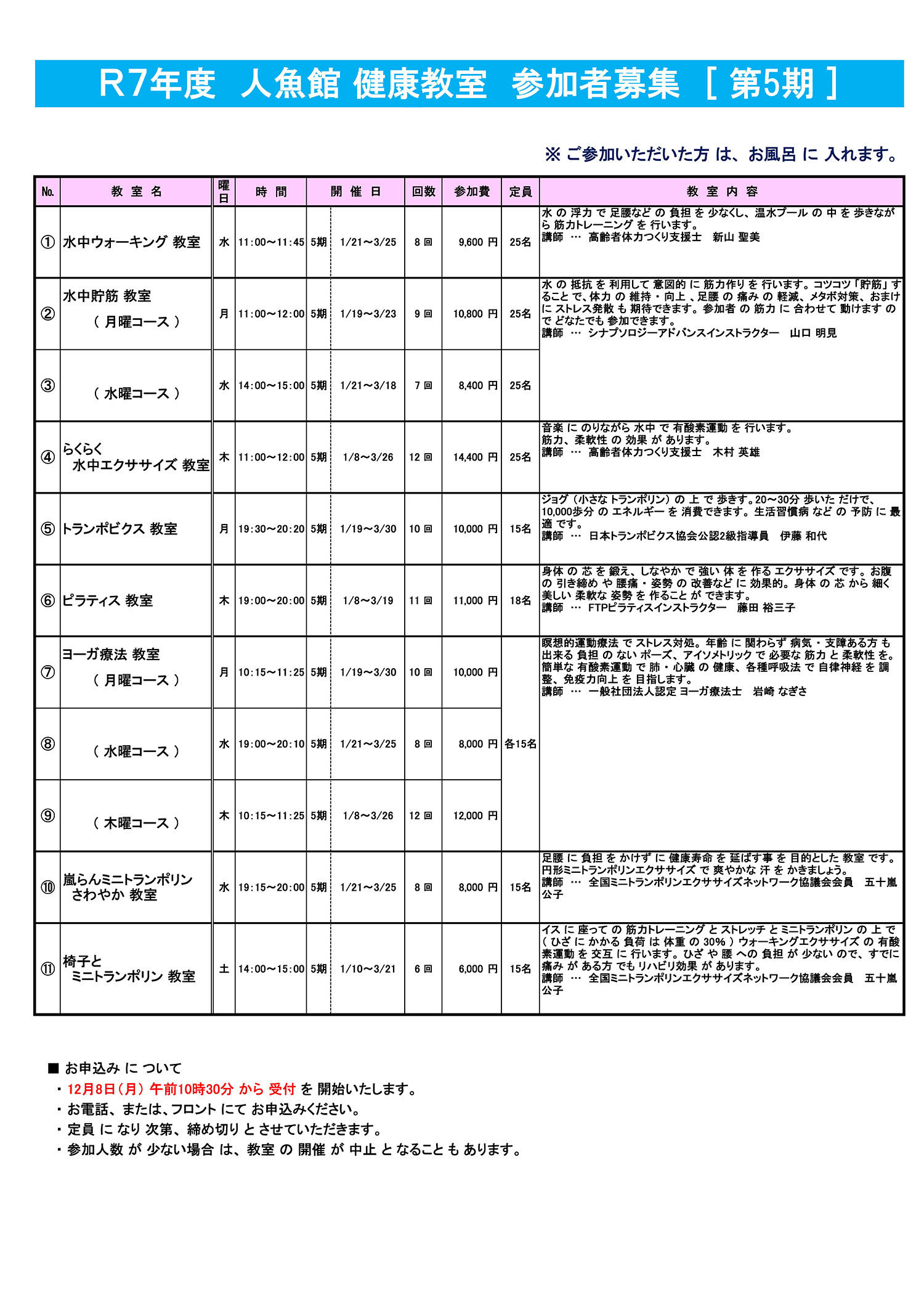「 令和7年度 人魚館 健康教室 第3期 」 募集中です 。